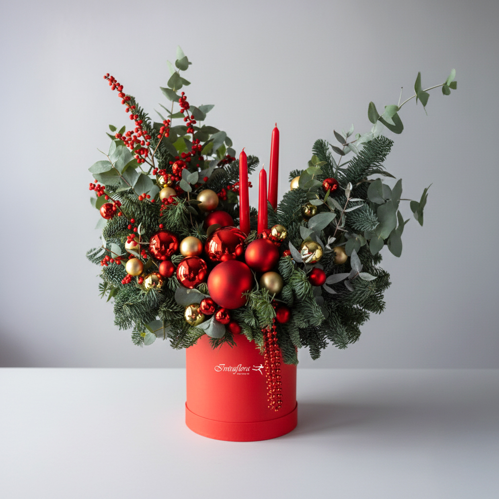 Bring sparkle and warmth to your festive décor with Christmas Jewel, a grand, high-volume bouquet that combines aromatic evergreens, shimmering ornaments, and elegant candles. Perfect for a striking table centerpiece or mantel display that radiates luxury.