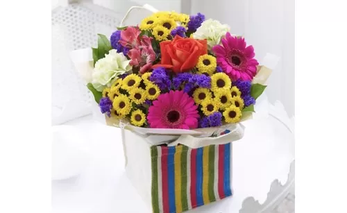 Surprise and delight them than with this colourful gift bag full of flowers. With vibrant shades of burnt orange, hot pink, sunshine yellow and deep purple, this selection is a celebration of colour and a real feast for the eyes.Featuring green carnations, red alstroemeria, cerise germini, orange long-stemmed rose and yellow spray chrysanthemums with purple statice and salal, presented in a harlequin jute bag.